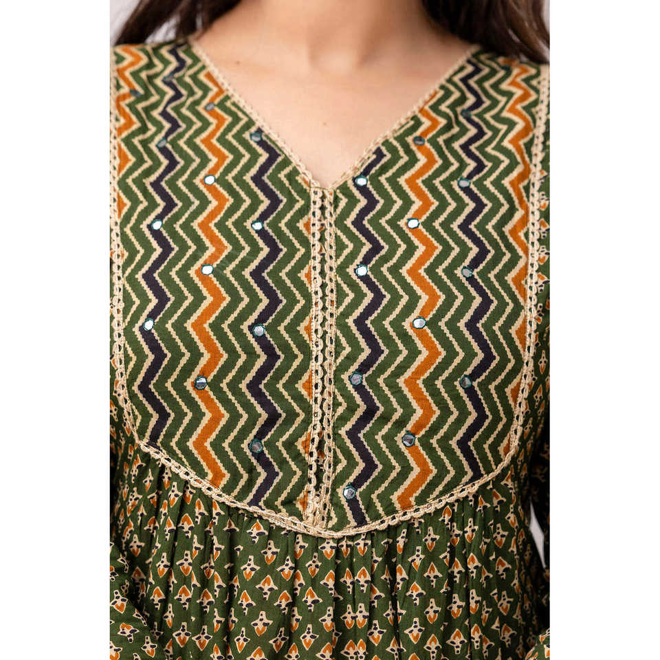 Mirror Work Yoke design,three-quarter regular sleeves,flared hemTop Features