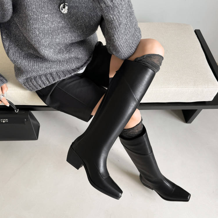 Bottes Western à talon carré fermé en cuir véritable fait main, couleur unie, rétro, décontractées, talon épais, mode