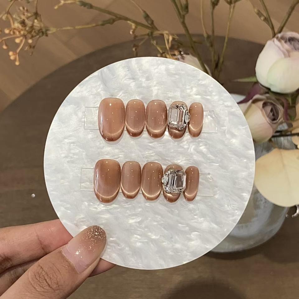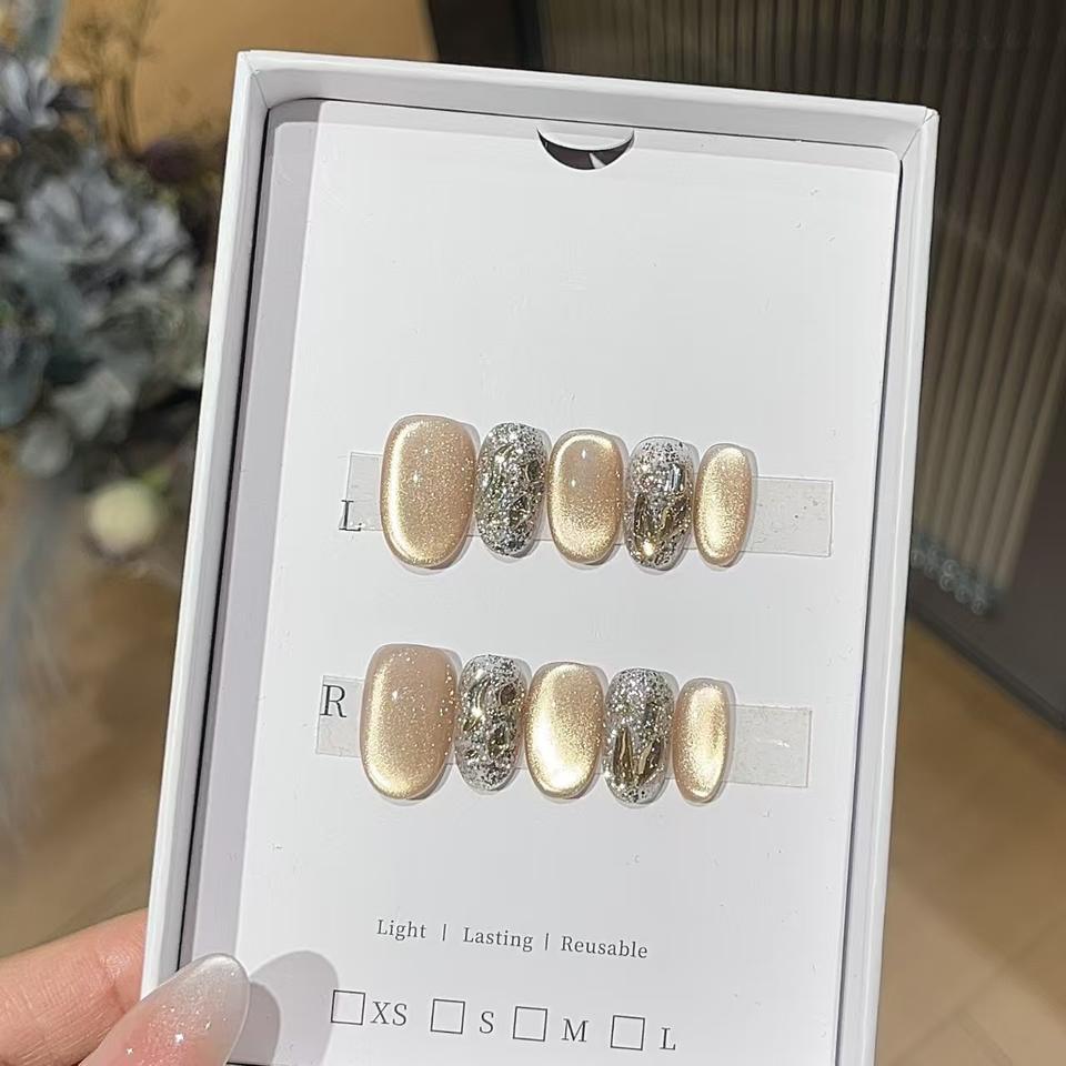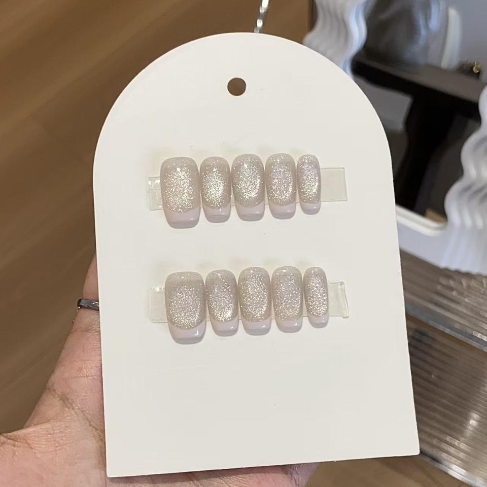 Pure Handmade Press on Nails Light French Style Square Gel Faux Ongles Artificiels Avec Beige Cat Eye Ongles Artificiels
