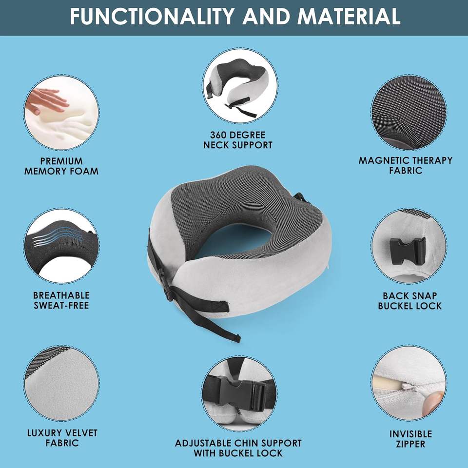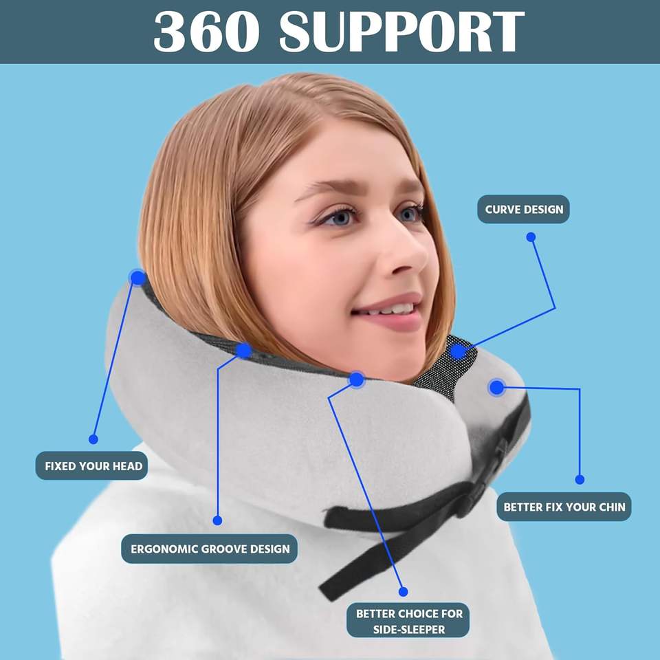 Oreiller de voyage en mousse à mémoire pure Oreiller pour le cou comprenant un sac de voyage compact et un masque pour les yeux 3D pour un confort ultime sans latex