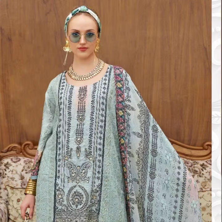 Shalwar Kameez brodé à la main en mousseline pure avec Dupatta imprimé numériquement et fond Santoon en viscose Tendance exigeante
