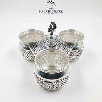Ensemble Kumkum Haldi Chawal en argent pur avec poignée en forme de paon, article traditionnel gravé à la main pour le temple familial