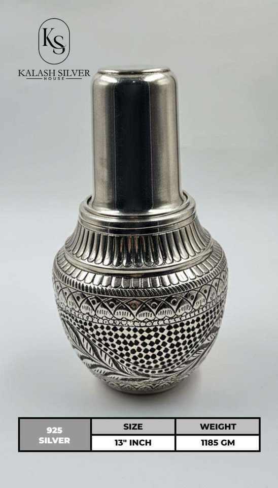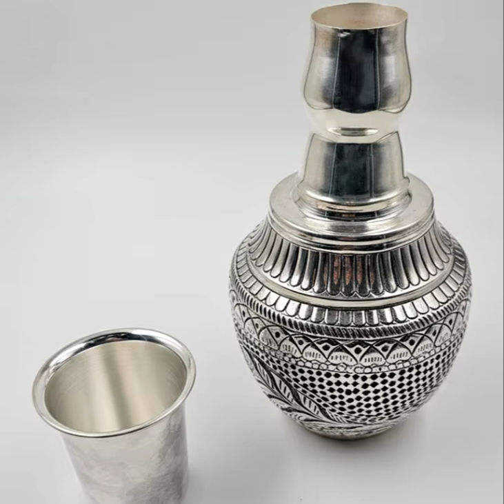 Bouteille d'eau en argent pur avec verre, gravure florale traditionnelle, vaisselle en argent artisanale pour un usage quotidien et des cadeaux