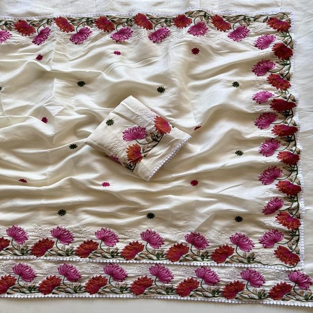 Pure Tussar Silk Women's Saree in Solid Color with Embroidery and Viscose Thread Work Indian Clothing for Adults