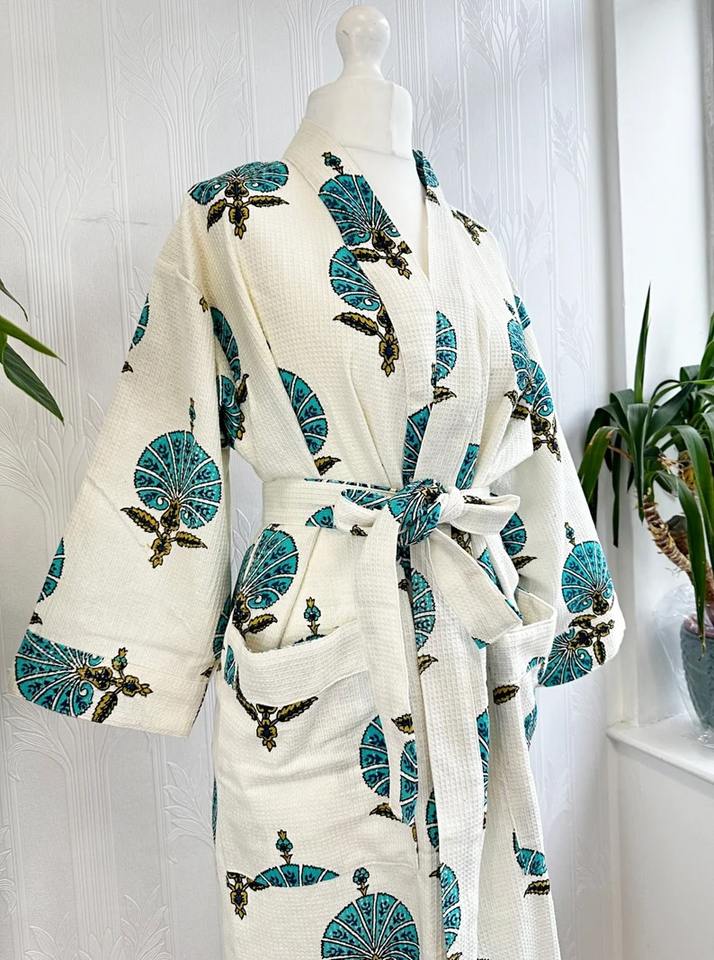 Pure Waffle Cotton Handprinted Women's Sleepwear Pastel White Turquoise Mughal Floral Print Summer Kimono Bathrobe Spa Cover Set