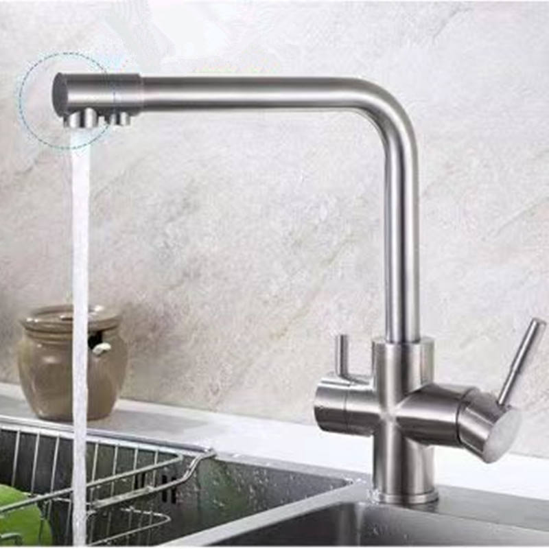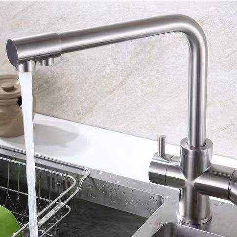 Robinet de cuisine filtrant à eau pure, trois voies, en acier inoxydable, avec deux poignées et bec verseur, personnalisable avec images et vidéos