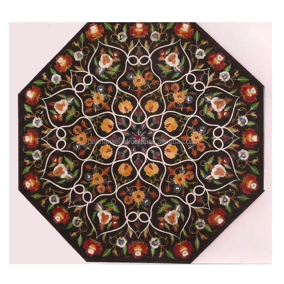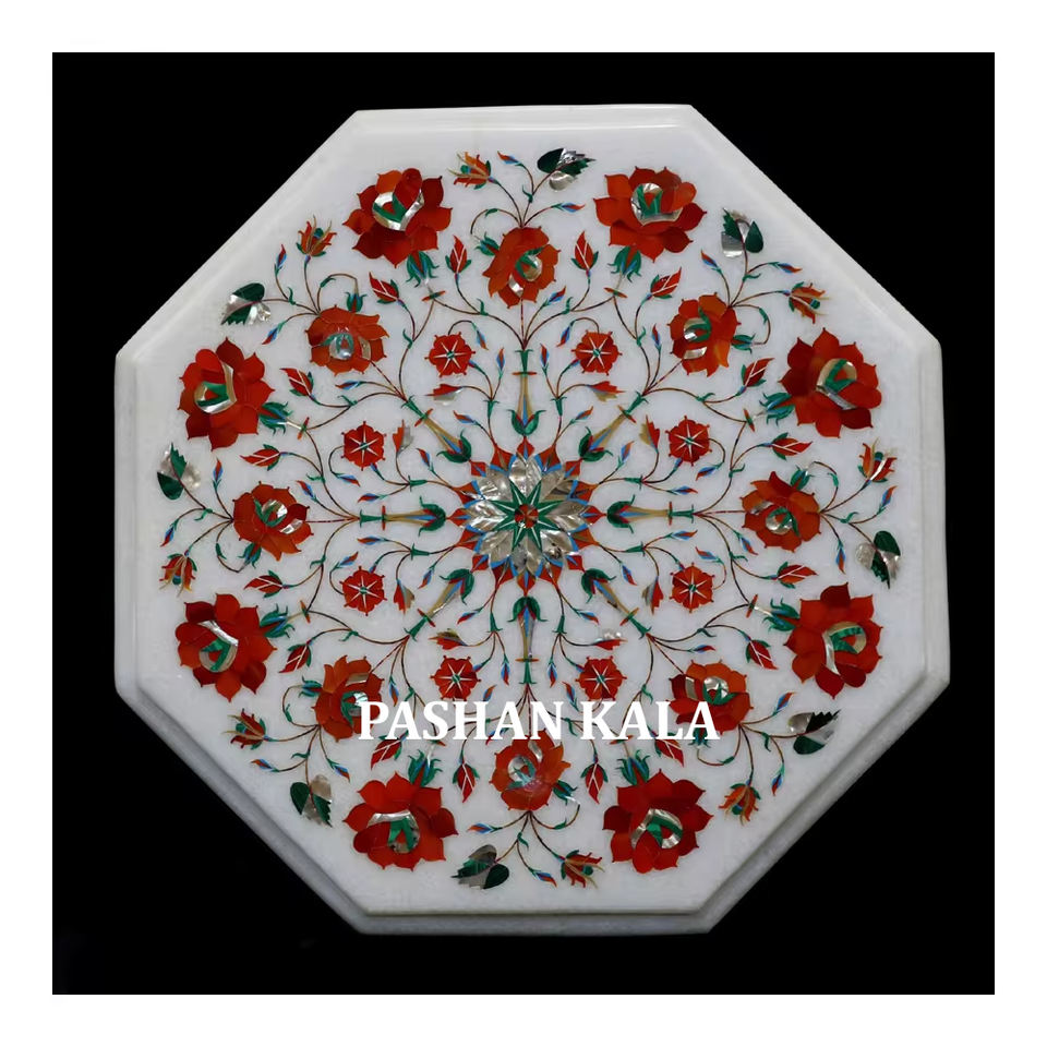 Table de salon en marbre blanc pur, forme octogonale, incrustée de motifs floraux, d'un aspect magnifique, idéale pour la décoration de la maison et des hôtels.