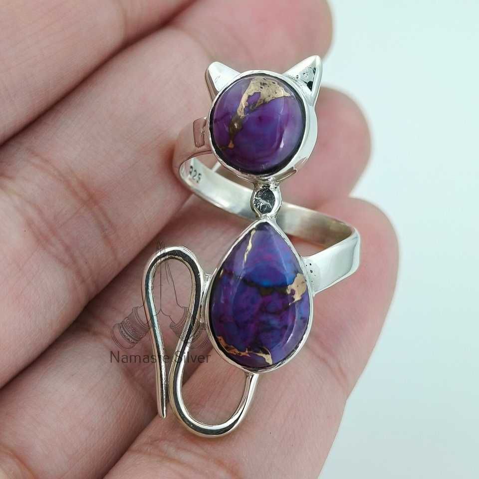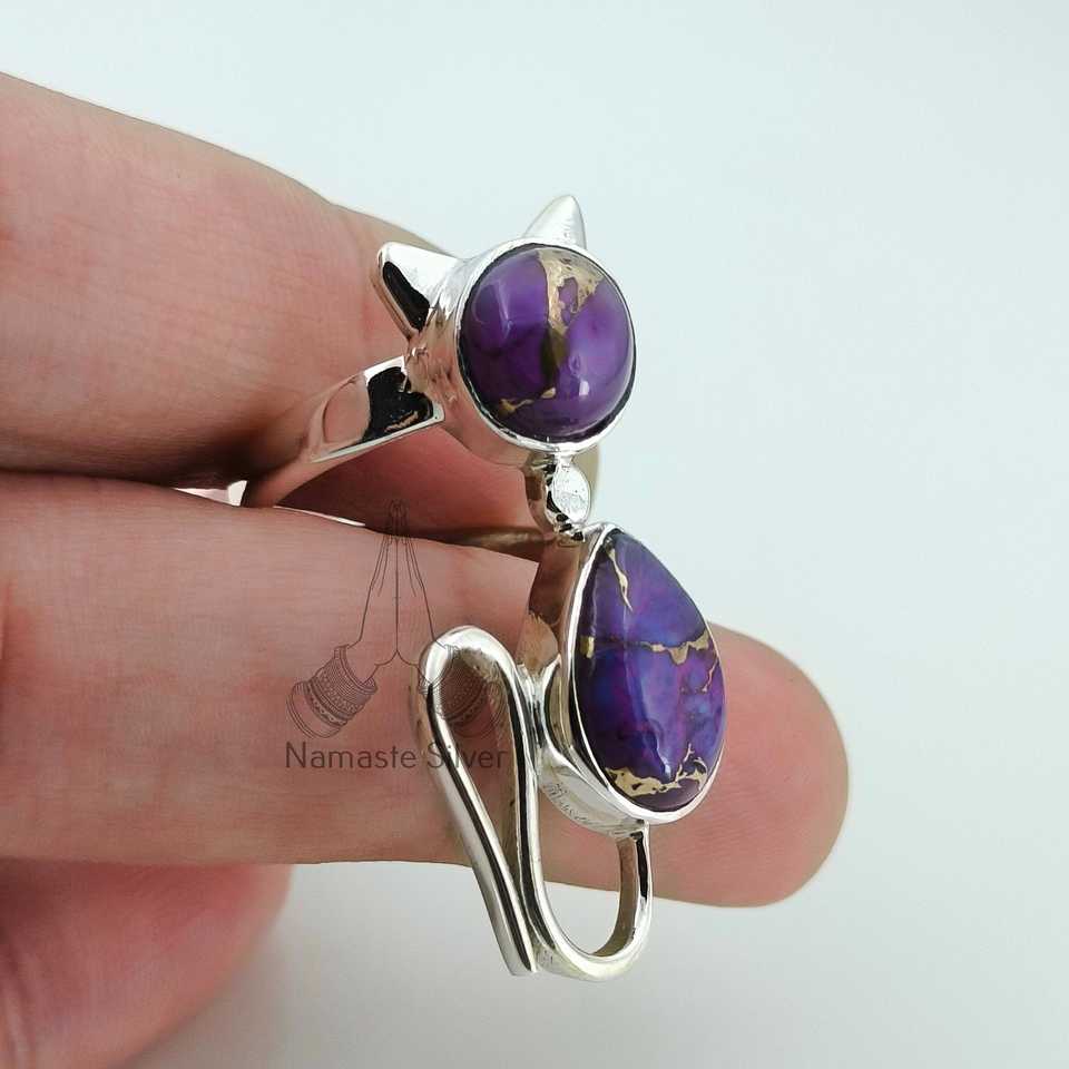 Bague chat en cuivre violet, turquoise et rubis, faite à la main en argent sterling, pour anniversaire, Noël, Saint-Valentin, cadeau pour femme