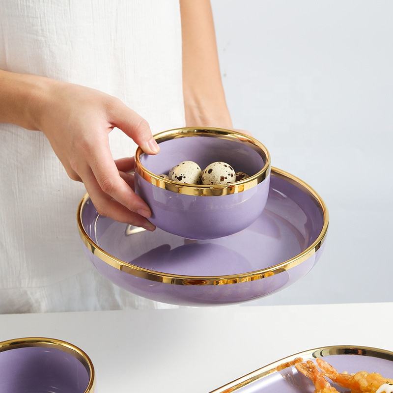 Vaisselle à bord doré de luxe violet Plats de dîner en céramique Bol Assiettes Ensembles de vaisselle en porcelaine allemande