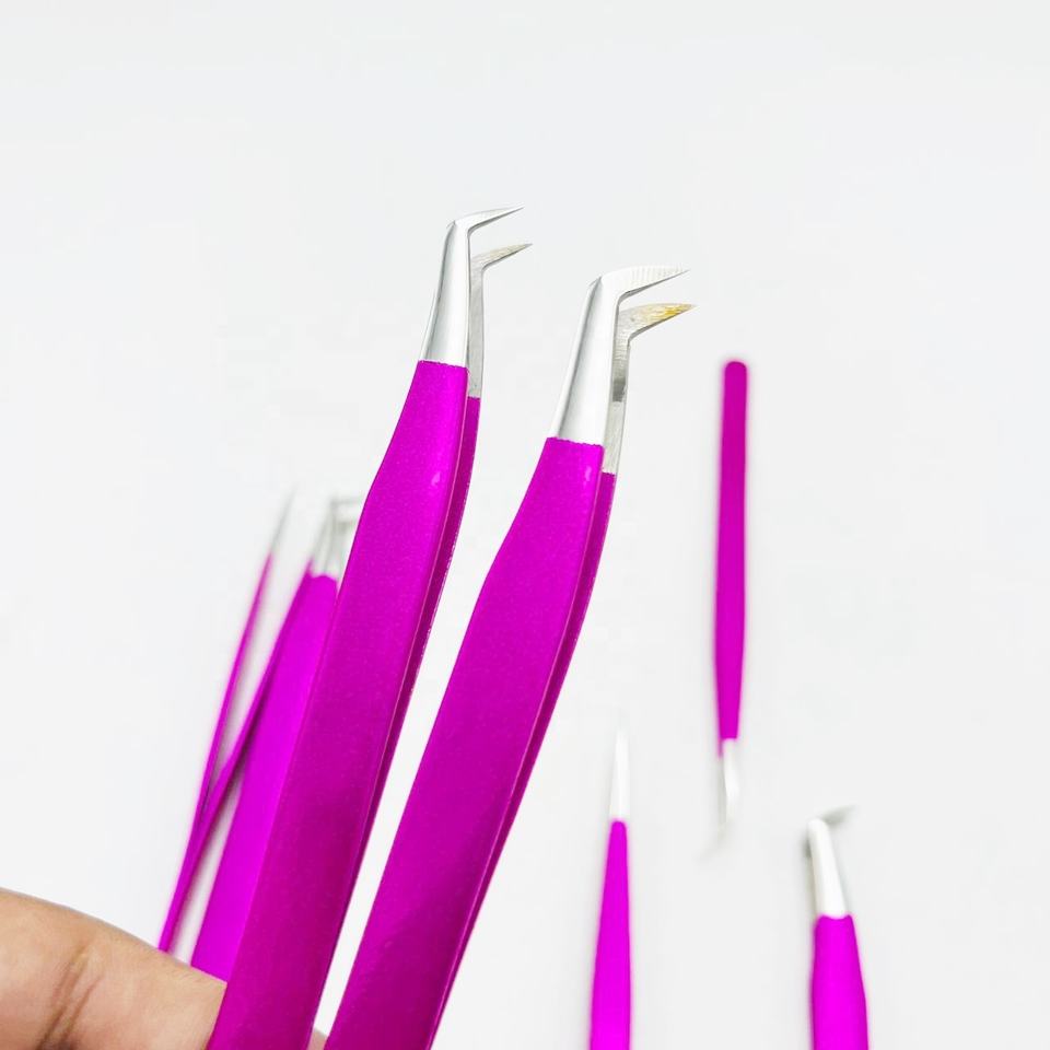 Pince à épiler à pointe polie coudée en poudre violette Logo de couleur personnalisé Extension de cils en acier inoxydable antibactérien