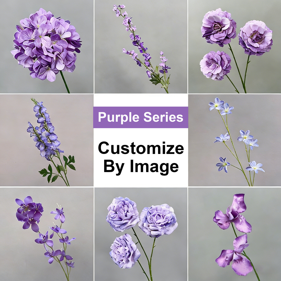 Collection de fleurs artificielles série violette, faites à la main, personnalisables selon l'image, matériel floral, arrangement de mariage, décoration de la maison DIY