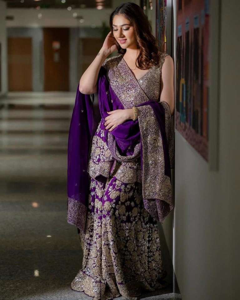 Ensemble Sharara Kurta violet avec broderie de fils et de sequins, comprenant 3 pièces en faux Georgette avec broderie de fils et de sequins, composé d'un haut, d'un Sharara et d'un Dupatta.