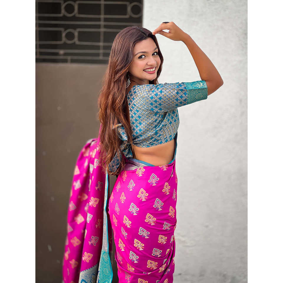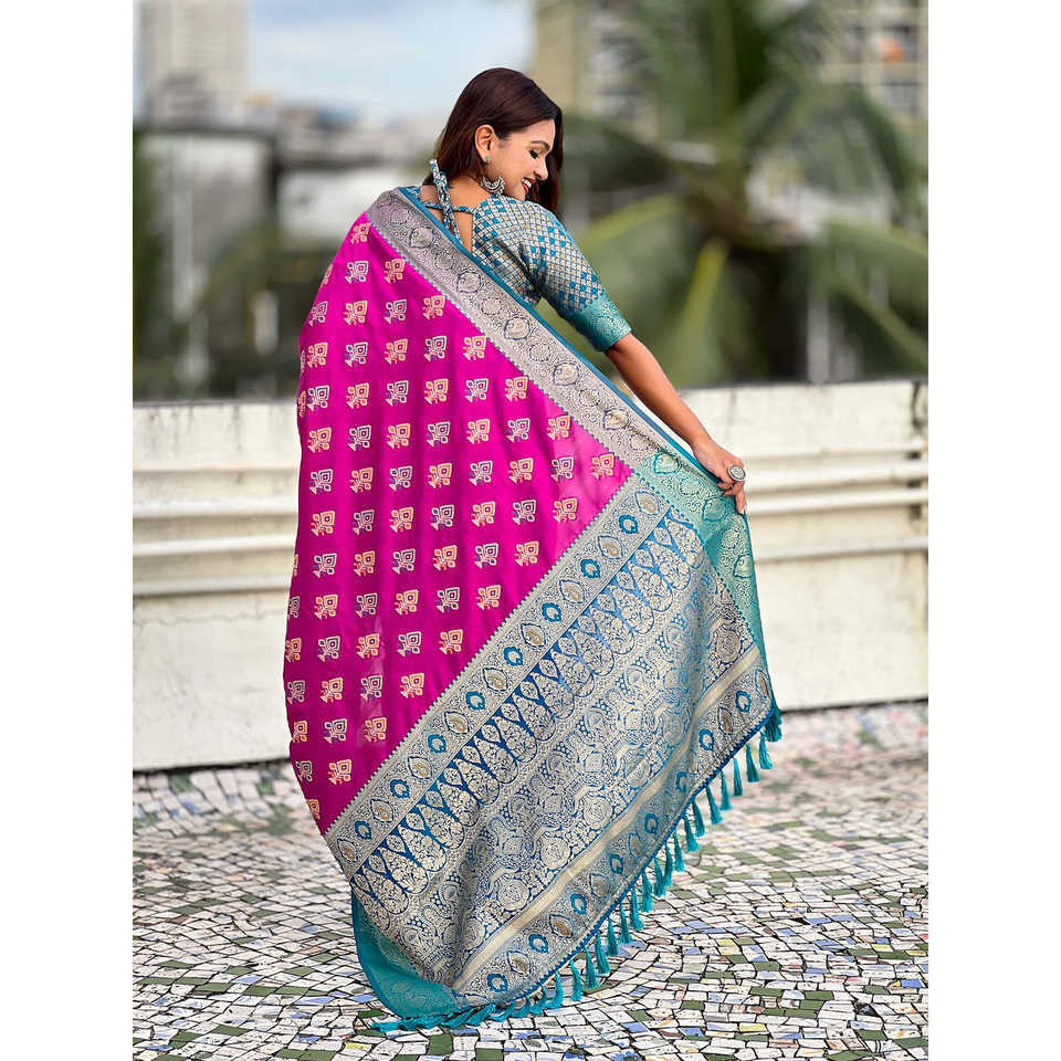 Elite Weaves Purple Soft Silk Zari Woven Ikkat Patola Saree with Contrast Weaves Elegant Evening Dresses 600g
