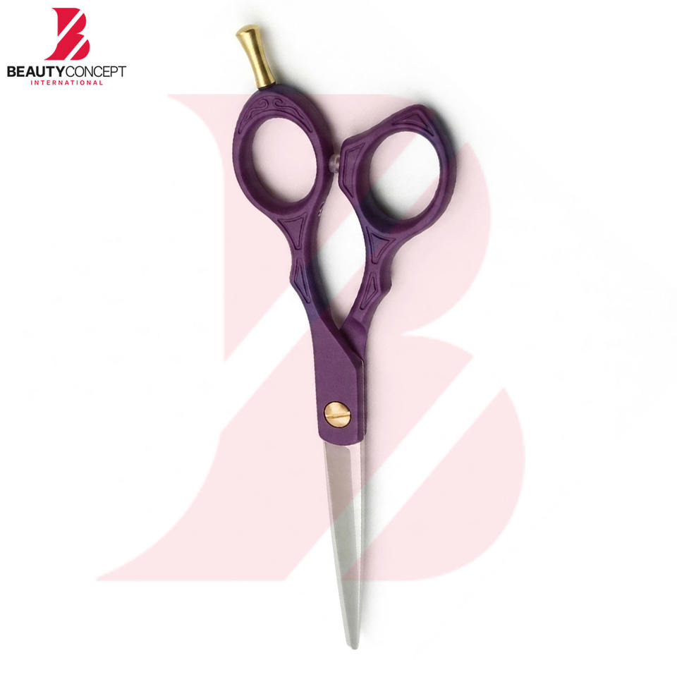 Ciseaux de barbier professionnels en acier inoxydable avec manche en plastique texturé violet et vis de tension dorée