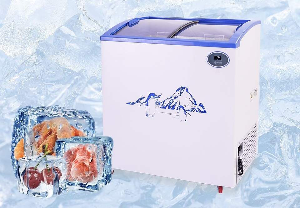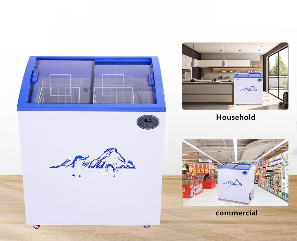 Congélateur coffre miniature à température unique Pusen pour la crème glacée, petit congélateur, vitrine de supermarché, réfrigérateur avec porte coulissante en verre