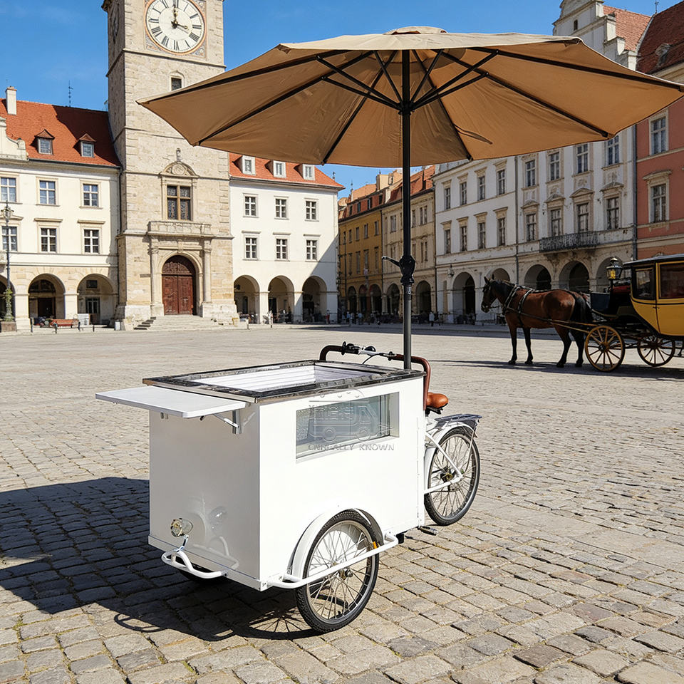 Vélo cargo électrique avec glacière pour crème glacée et boissons fraîches, avec parapluie, en promotion
