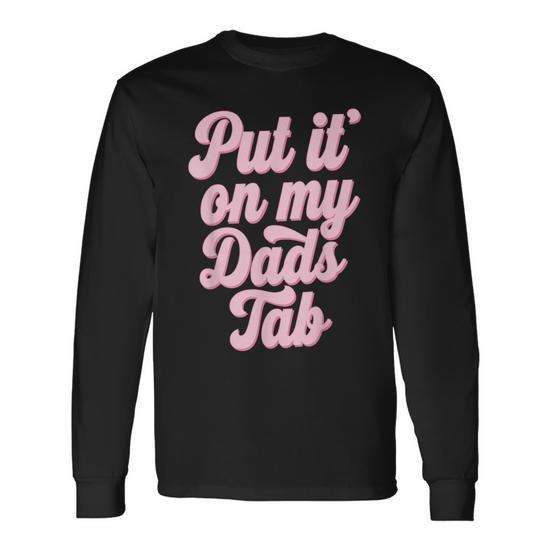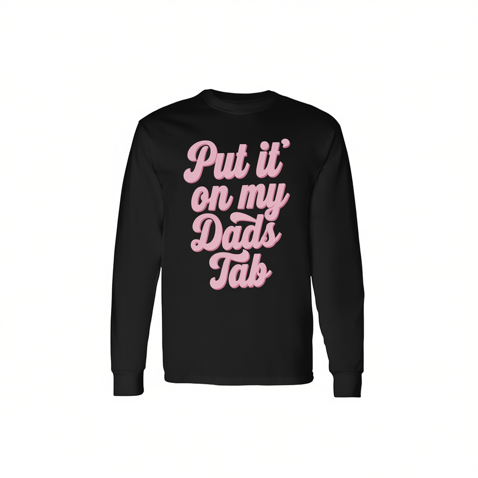 T-shirt à manches longues Put It On My Dads Tab, texte rose, col rond noir
