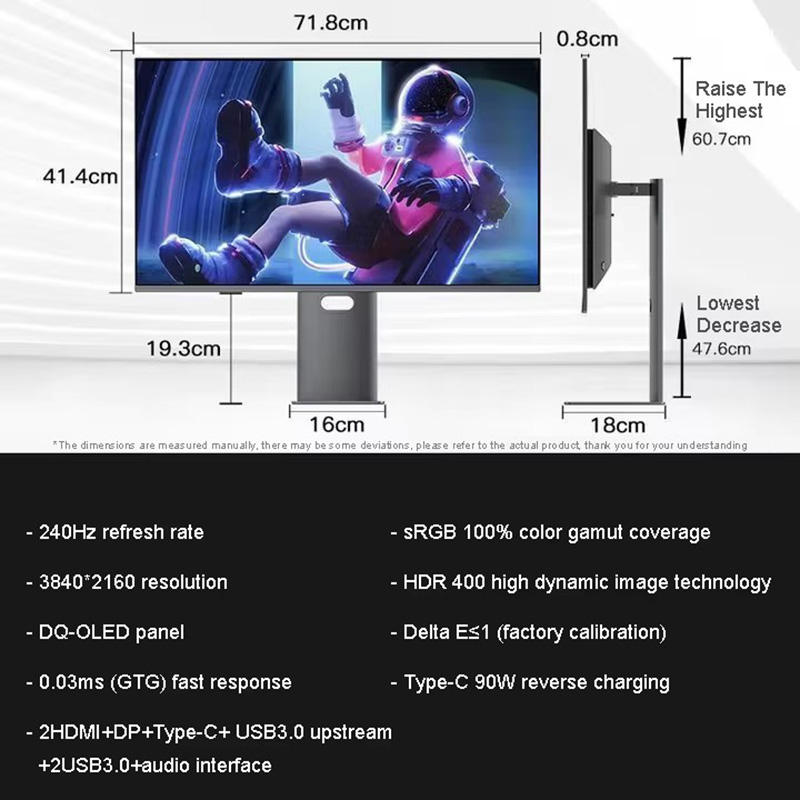 QD-OLED Moniteur de jeu OLED 4K 240Hz 32 pouces UHD 0.03ms True Black HDR 1000 90W USB Type C