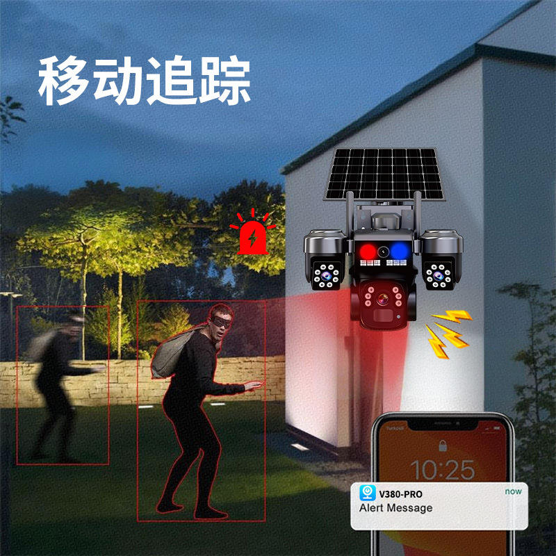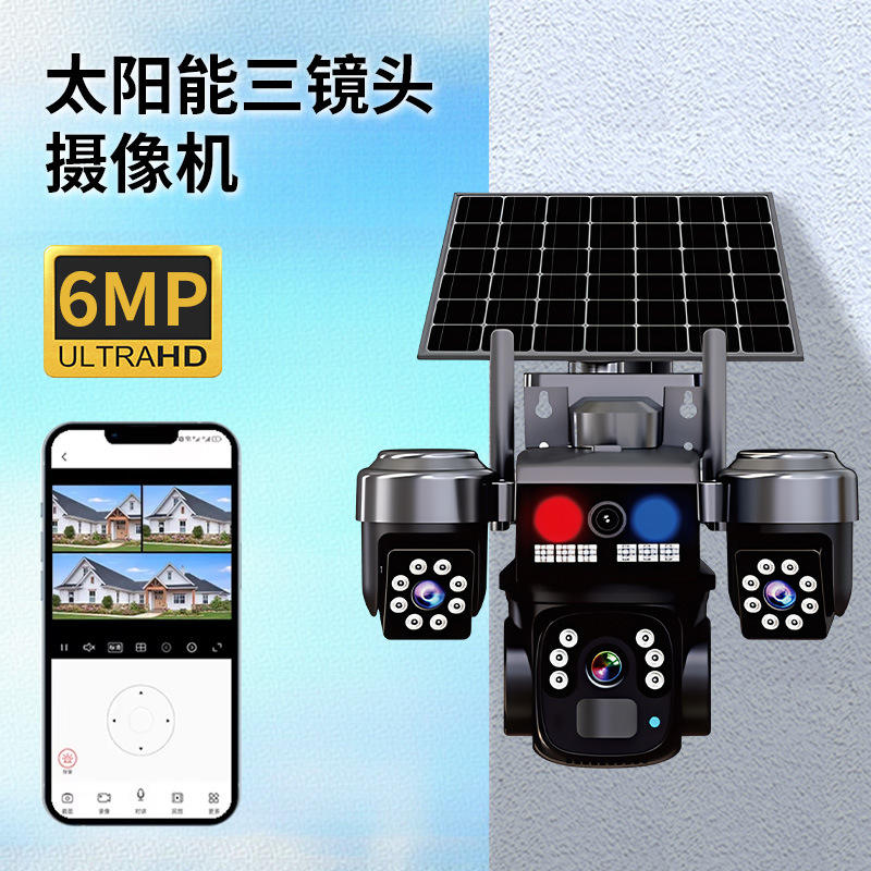 Caméra de surveillance solaire extérieure QD5 à triple objectif 4G avec stockage cloud et interphone vocal, suivi automatique