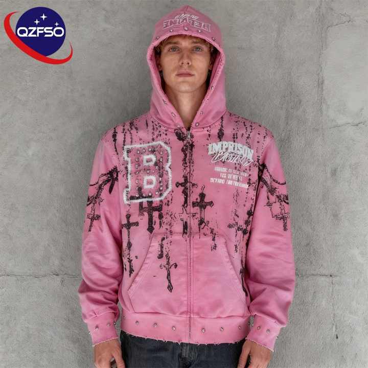 QZFSO Custom Heavyweight 100% Cotton Distressed Printed Zip up Unisex Hoodie Graphic Oversized Vintage Acid Wash Hoodie for Men