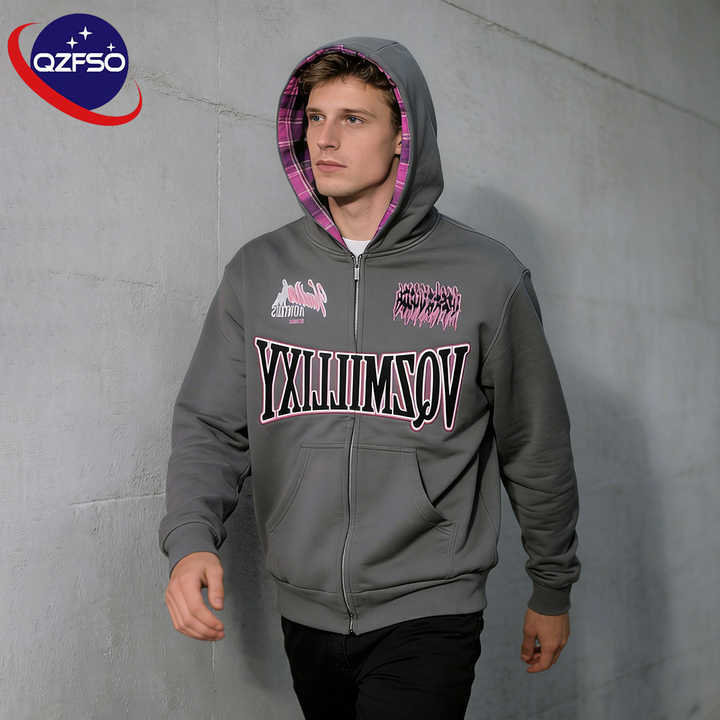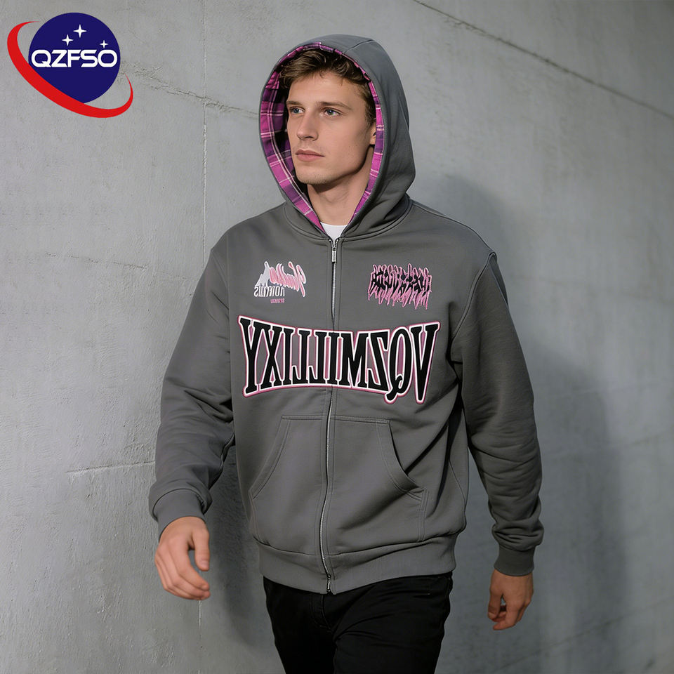 Sweat-shirt à capuche zippé surdimensionné en coton vintage pour homme, avec broderie et impression graphique personnalisées, effet vieilli et délavé à l'acide, par le fabricant QZFSO