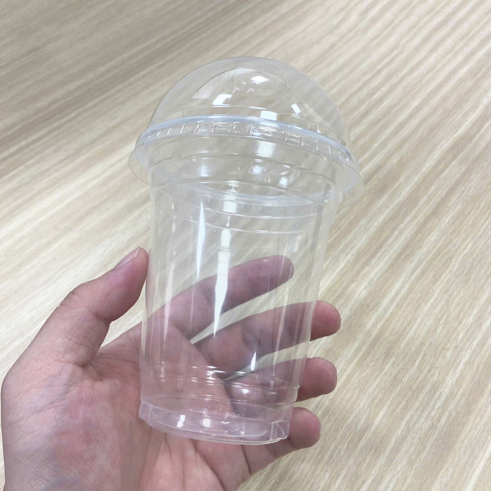 Quang Quan 95mm 400ml 14oz Disposable Clear Plastic Cup with U Shape Bottom Flat Bottom Lids Single Wall Iced Coffee Serving Set