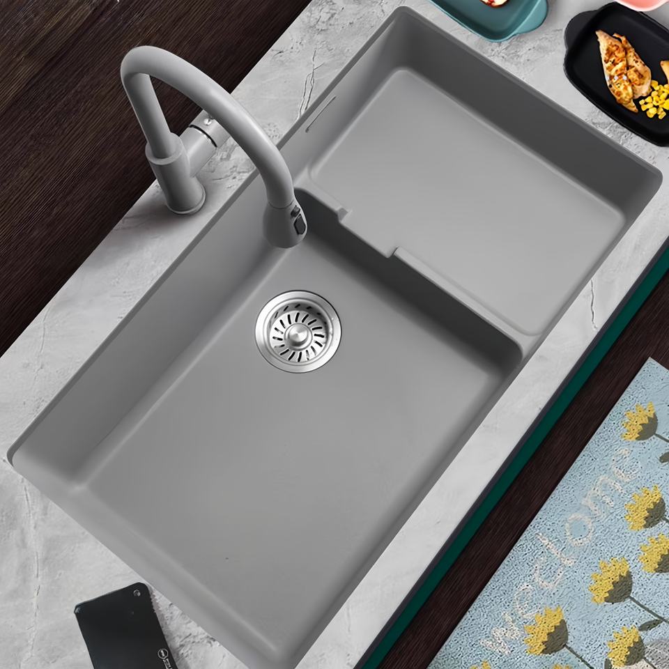 Évier de cuisine en quartz à poser sous le plan, design à escalon, cuve unique, résistant à la chaleur et aux rayures