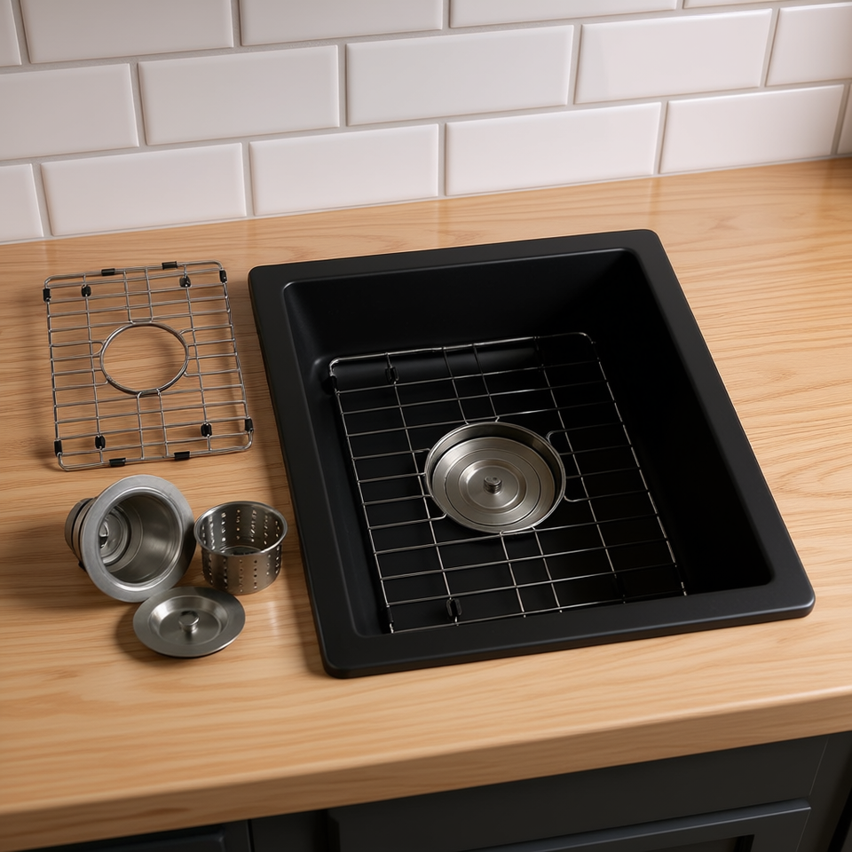 Évier de bar en quartz à encastrer 13,77 x 17,71, cuve unique, finition mate, avec panier égouttoir