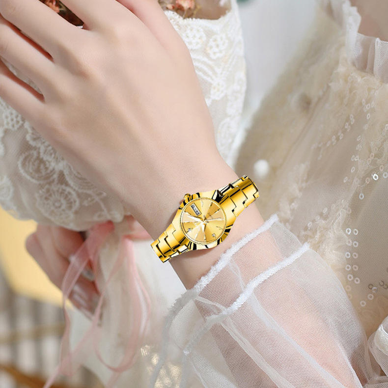 Montre à quartz, montre à quartz pour couple, plaquée or avec diamants, bracelet en acier inoxydable étanche