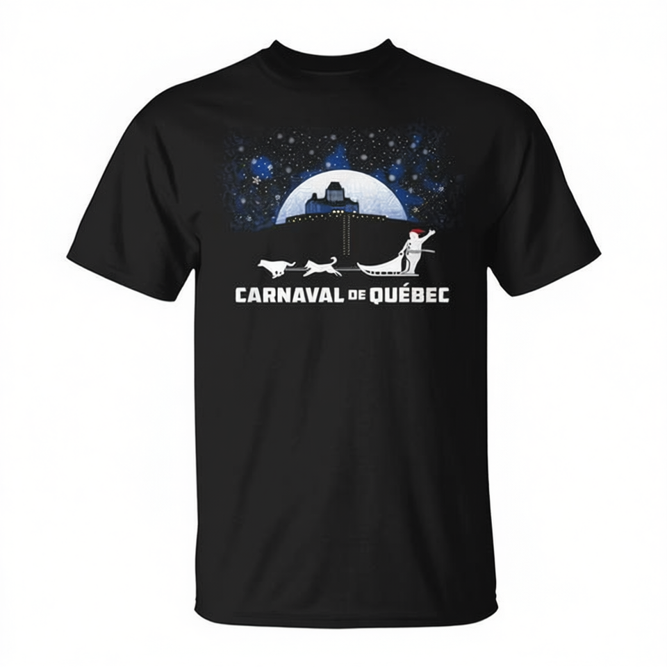 T-shirt promotionnel du Carnaval d'hiver du Québec avec motif chien de traînée, luge et bonnet rouge avec écharpe