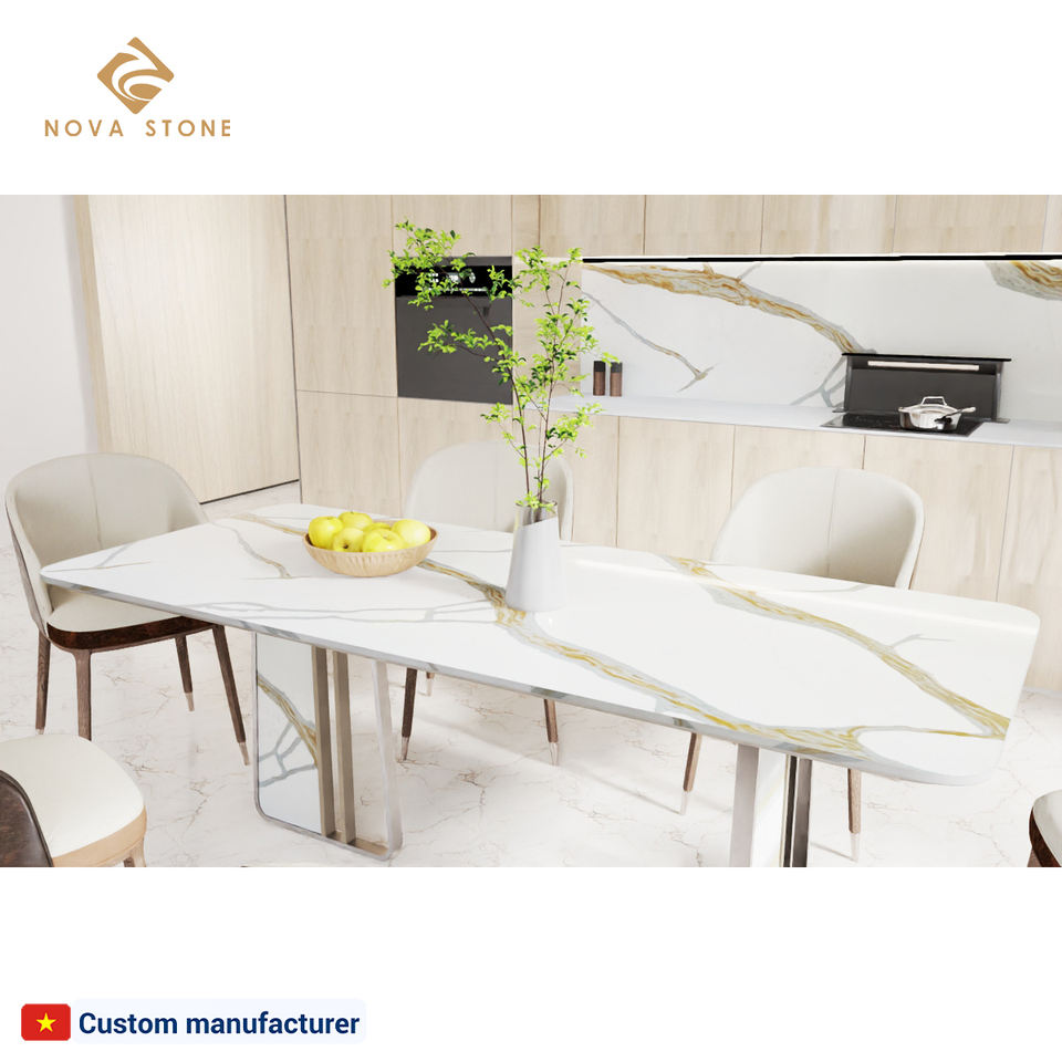 Livraison rapide Table à manger en quartz Forme sur mesure Rectangle Cercle Ovale Disponible Déclaration Quartz Motif Pierre Table à manger