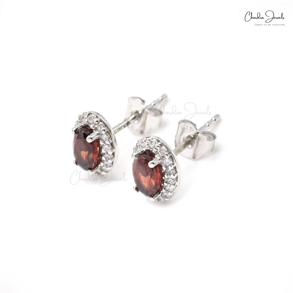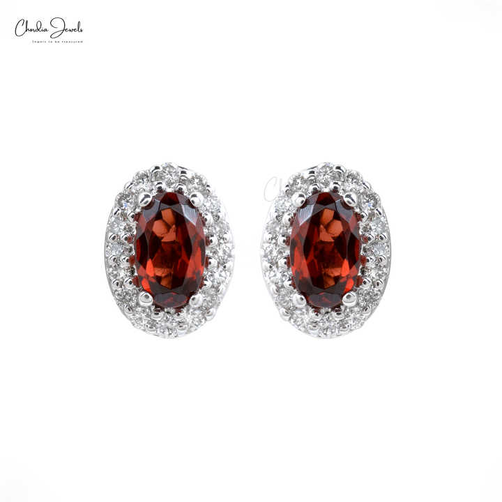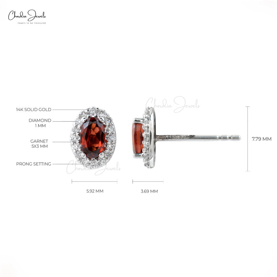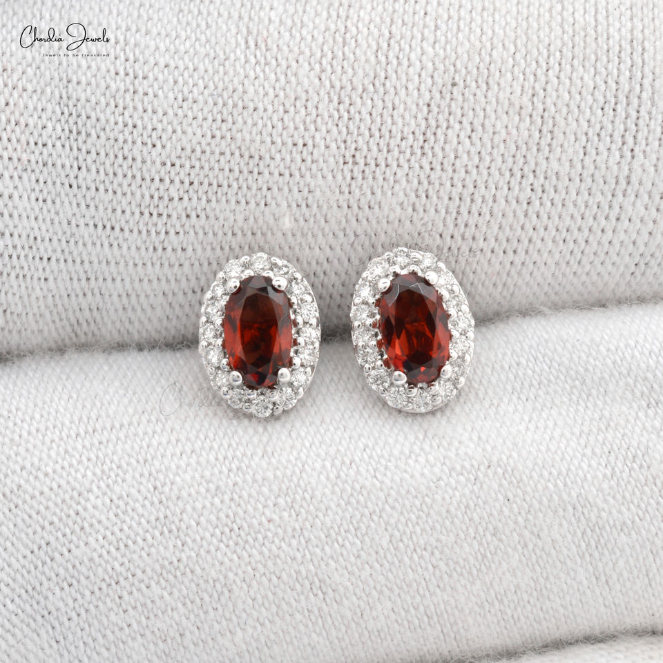 Expédition rapide, boucles d'oreilles en or blanc massif 14 carats, grenat ovale 5x3 mm, pierres précieuses et halo de diamants, certifiées IGI, bijoux à offrir