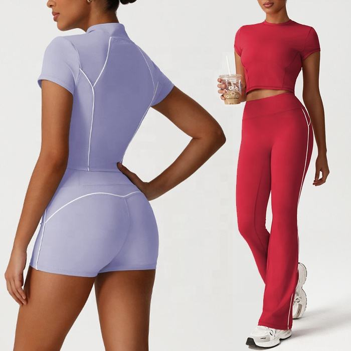 Ensemble de sport 3 pièces pour femme à séchage rapide, respirant et uni : Legging, veste de compression à manches longues et brassière de sport pour le yoga et la gym