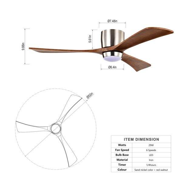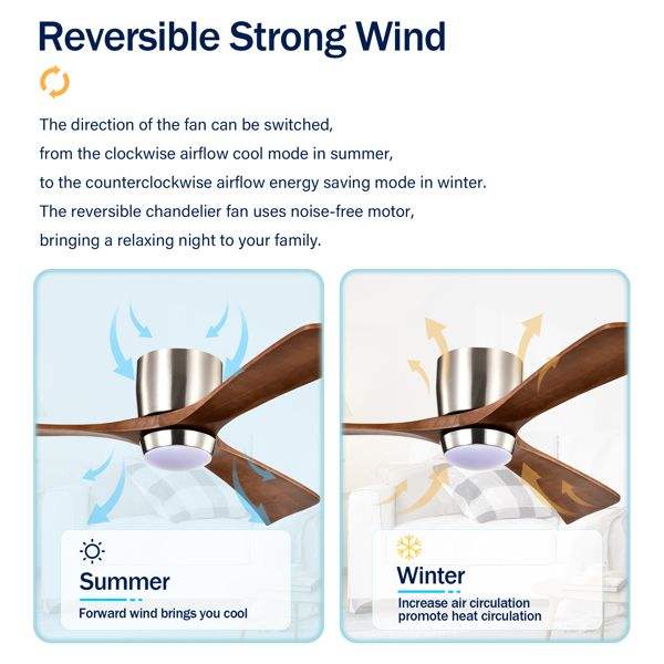 Ventilateur de plafond LED silencieux de 52 pouces avec 3 pales en bois et 6 niveaux de vitesse, moteur DC, télécommande, lumières réversibles incluses