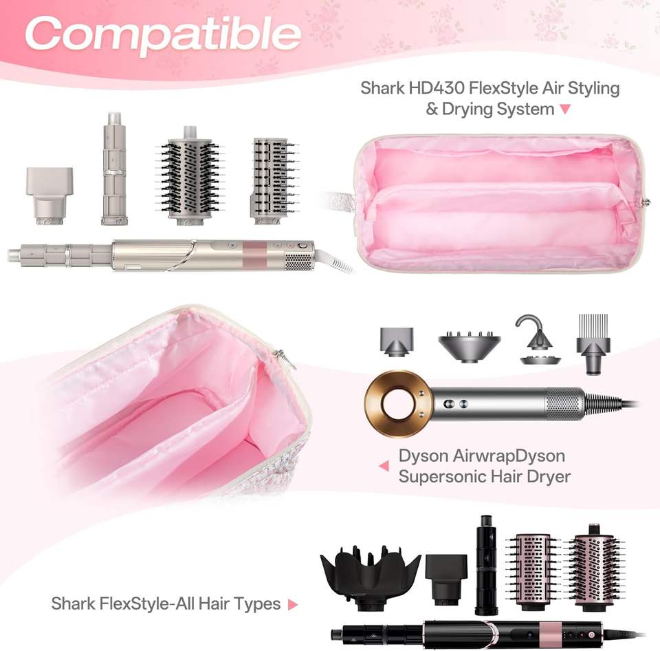 Sac de rangement multifonctionnel matelassé pour accessoires capillaires - Étui de voyage floral rose pour Dyson Airwrap et fer à boucler Revlon