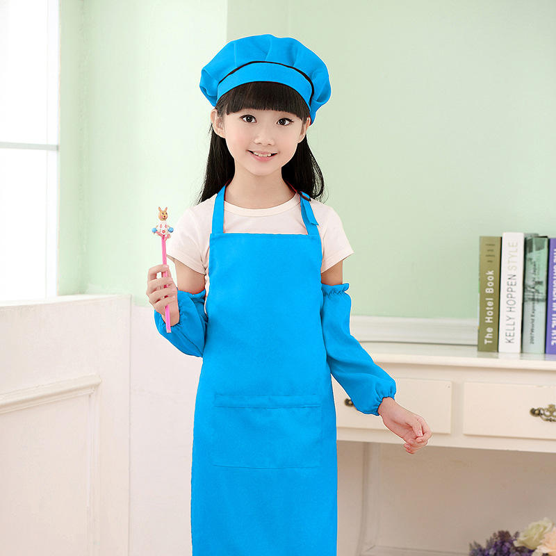 R1006 Tabliers de chef en polyester Tabliers de cuisine à bavette solides avec logo personnalisé avec poches Ensemble de tablier réglable pour enfants et chapeau de chef