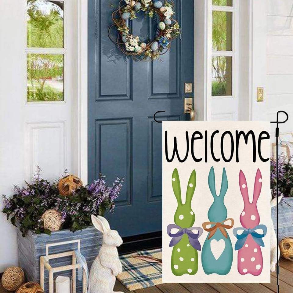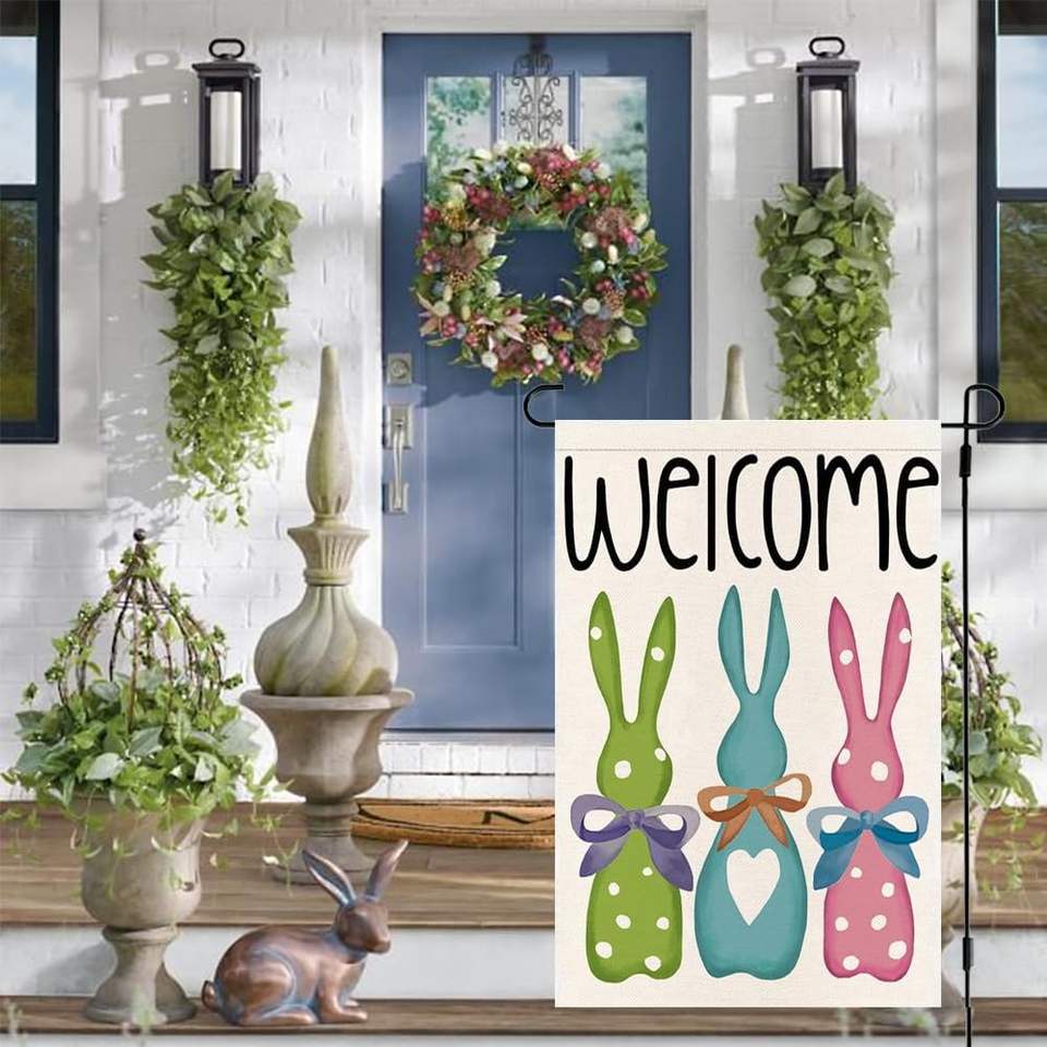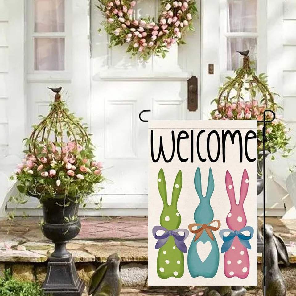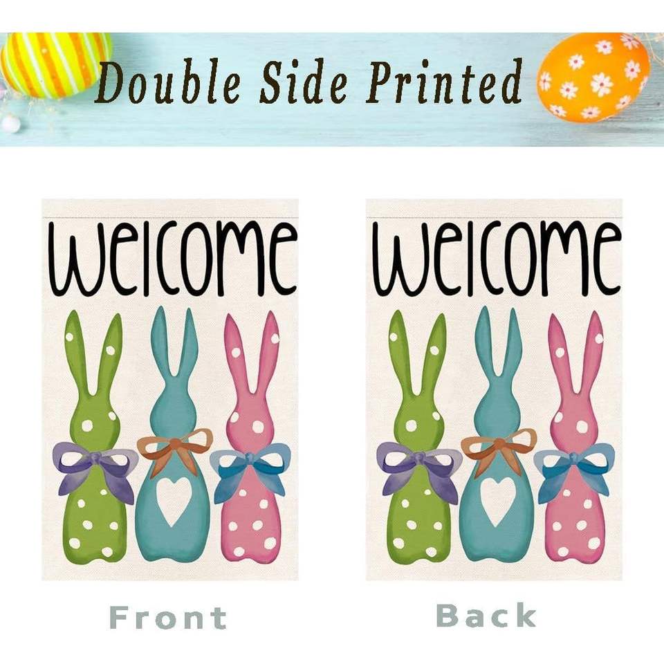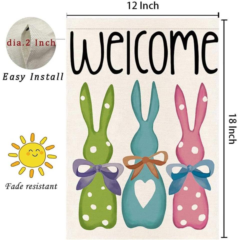 Drapeau de jardin RABUSOFA 12x18 pouces double face en toile de jute, motif lapin de Pâques coloré avec nœud, décorations de printemps pour l'extérieur YQ-REAA010
