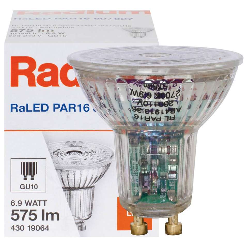Projecteur LED RADIUM PAR16 GU10 6,9W 2700K 36 Degrés Éclairage Intérieur Corps en Verre 575lm 25000 Heures Garantie 3 Ans