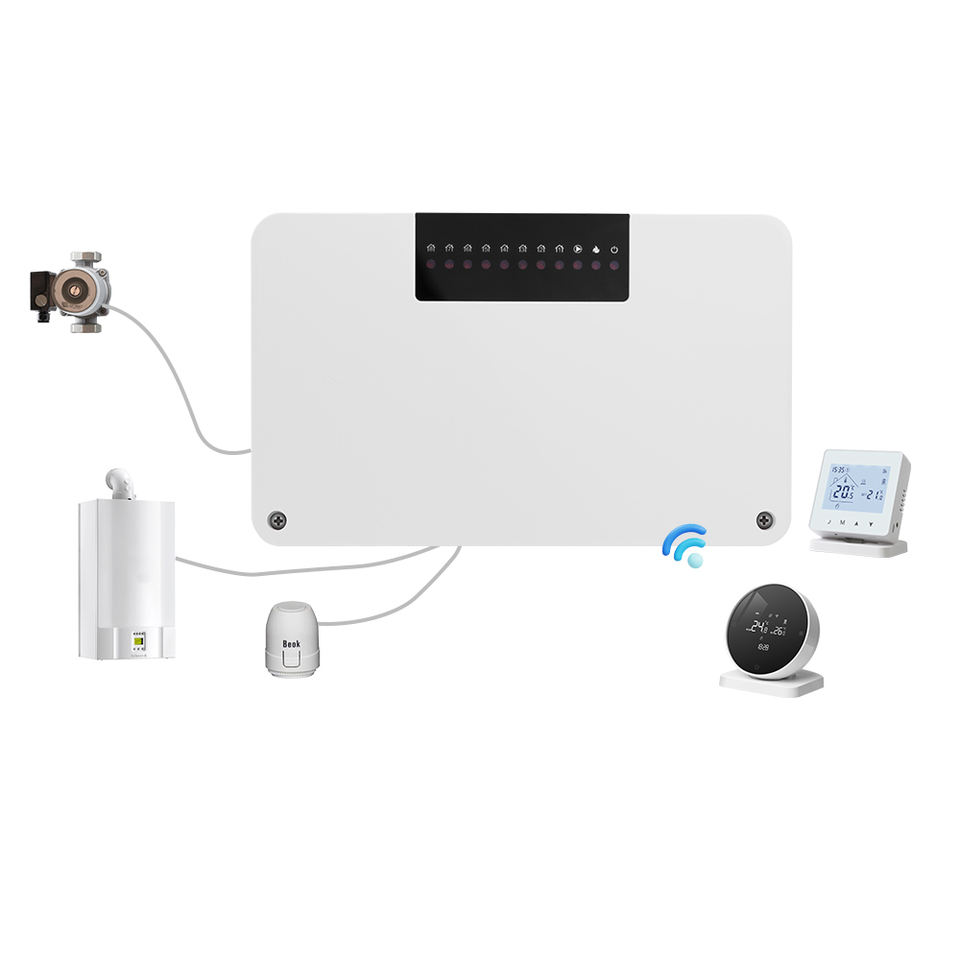 RF Wireless Floor Heating System Room Thermostat 8 Loops Hub Control Box and Normally Closed Thermal Actuators