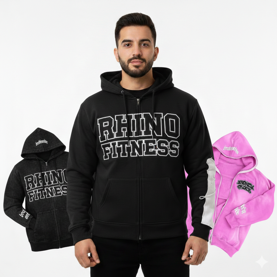Sweat à capuche brodé de haute qualité personnalisé RHINO FITNESS pour hommes | 100% coton | Vêtement ample pour l'automne | Sweat-shirts à poches 360 g/m²