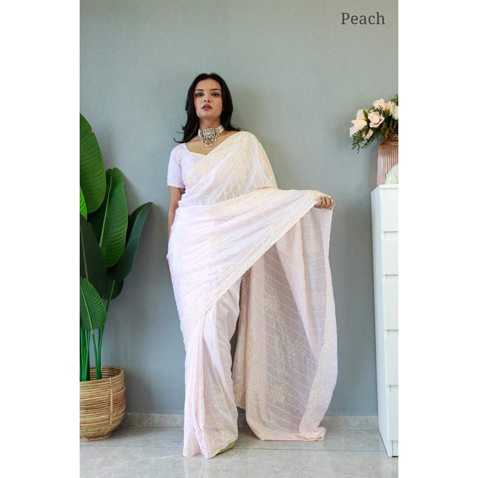 RICH LOOK CHINON SILK EMBROIDERY WORK SAREE WITH UNSTITCHED BLOUSE PEACH