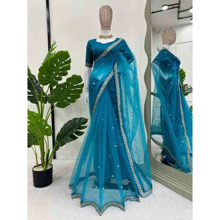 SAREE DE TRAVAIL DE SÉQUENCE DE CODAGE NET DOUX DE LOOK RICHE AVEC CHEMISIER NON COUDU CIEL