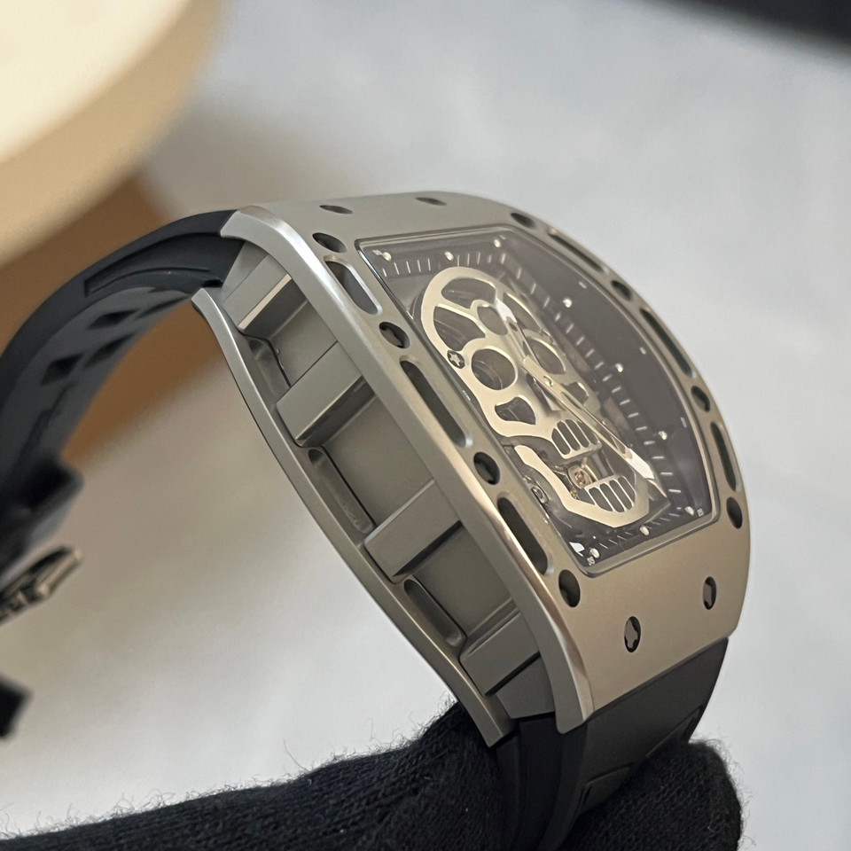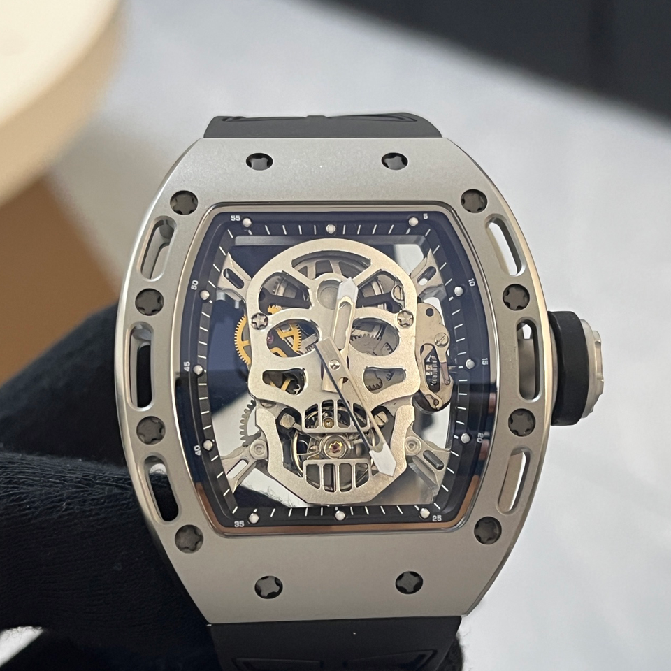 Montre automatique squelette style crâne RM5201, boîtier tonneau en carbone ou titane, verre saphir, bracelet en caoutchouc
