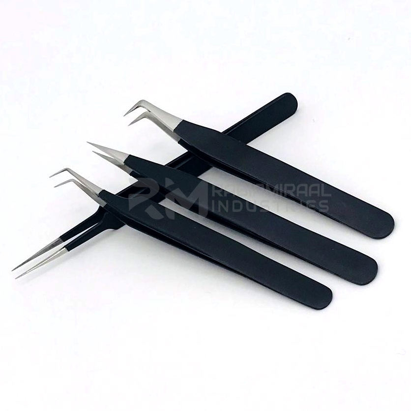 Pince à épiler professionnelle de précision en acier inoxydable RMI pour extensions de cils, pointes courbées/droites / pointe argentée / noir mat