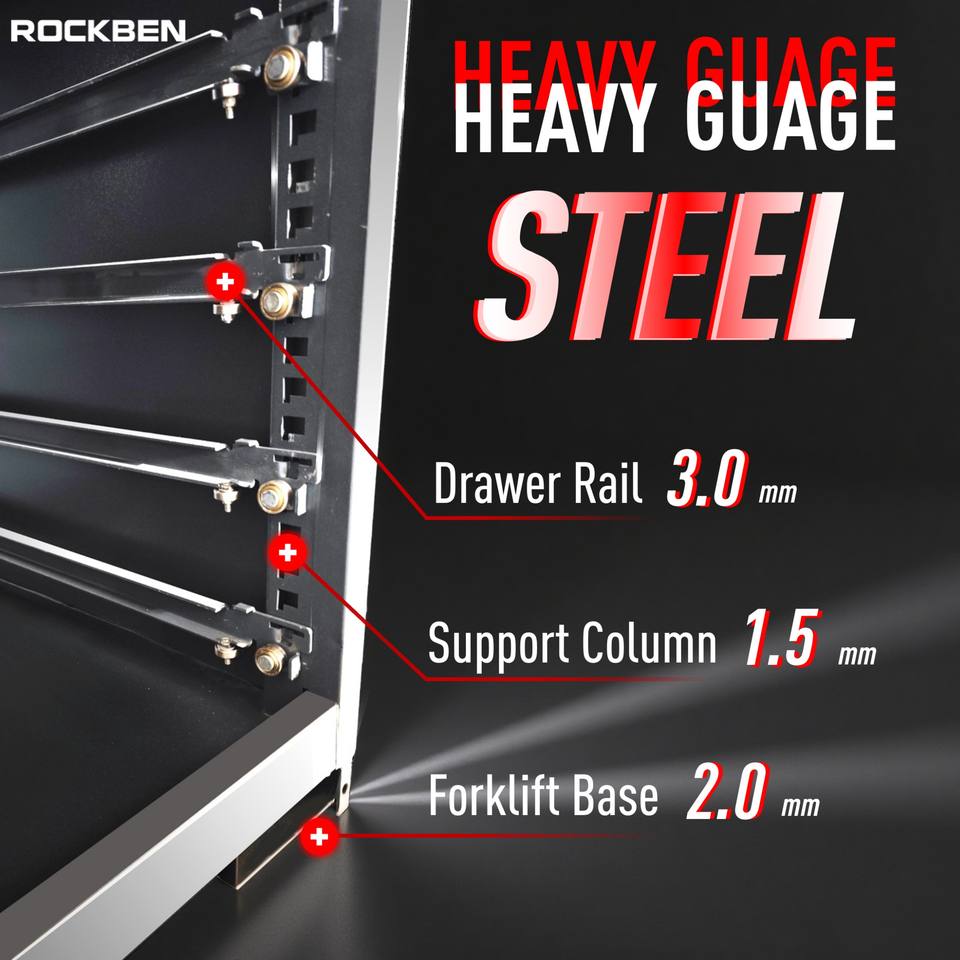 Système modulaire d'armoires de rangement d'outils pour atelier et garage ROCKBEN avec chariot à outils, établi et équipement combiné pour mécanicien