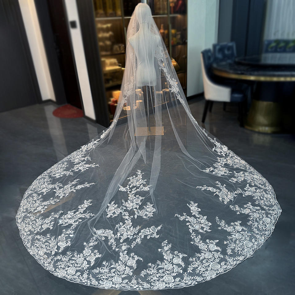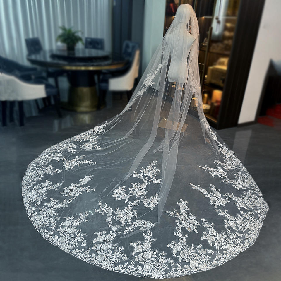Voile de mariée ROMANTIC à une seule couche, longue et à grande traîne, en dentelle florale, super brillante