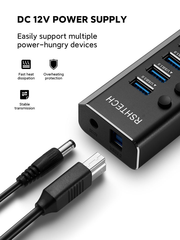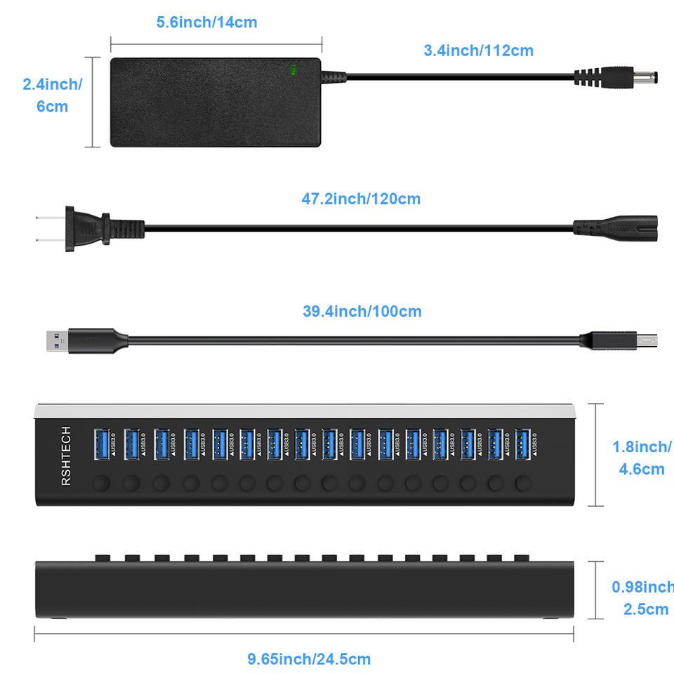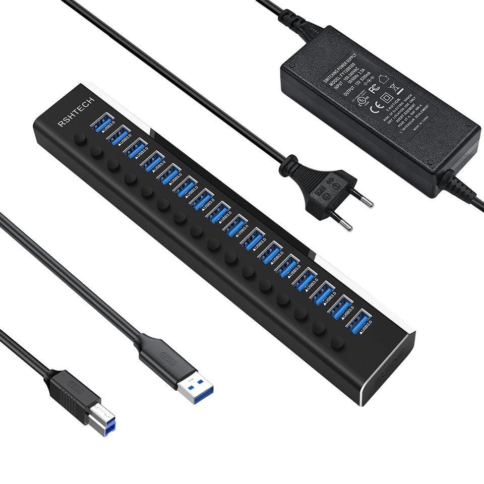 RSHTECH Hub USB 3.0 16 en 1 avec adaptateur d'alimentation 12V8A, interrupteurs séparés, 16 ports USB pour PC, accessoires informatiques