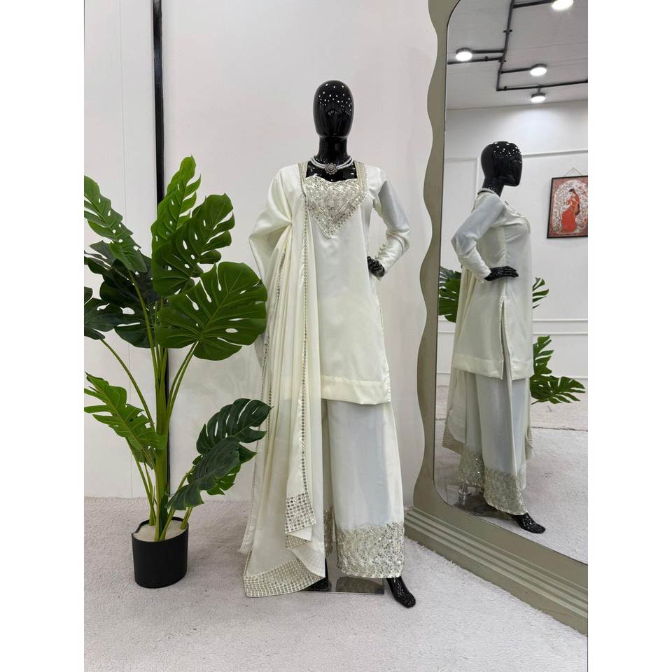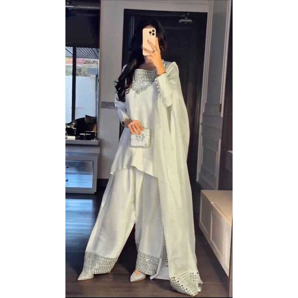 Ensemble RTC Designer White XL Top-Bottom et Dupatta avec filetage et travail de séquence