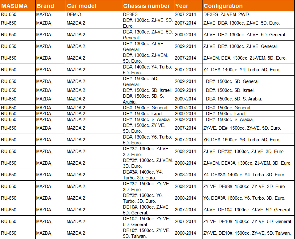 | MAZDA | 2 | 2007.10-2015.06 | 1.3 (55KW,75PS) |