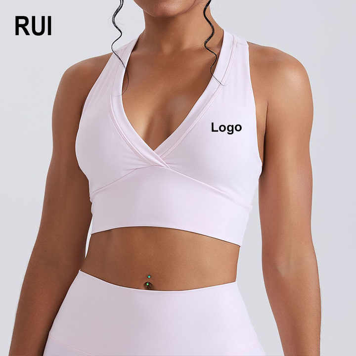 Soutien-gorge de sport RUIQUWIN personnalisé avec logo frontal, col en V, sans coutures, dos nu, léger, maintien élevé, évacuation de l'humidité, pour yoga et gym